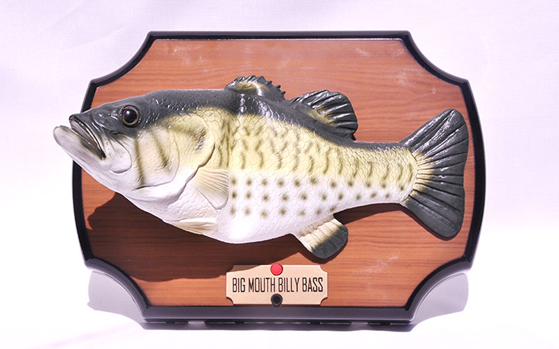 Big Mouth Billy Bass, der Fisch der singt und Kopf, Maul und Schwanzflosse zur Musik bewegt, ausgelöst durch einen Bewegungsmelder, Billy Bass kann als Tisch- oder Wandmodell  platziert werden, das High light der Jahrhundertwende, wieder erhältlich bei on top